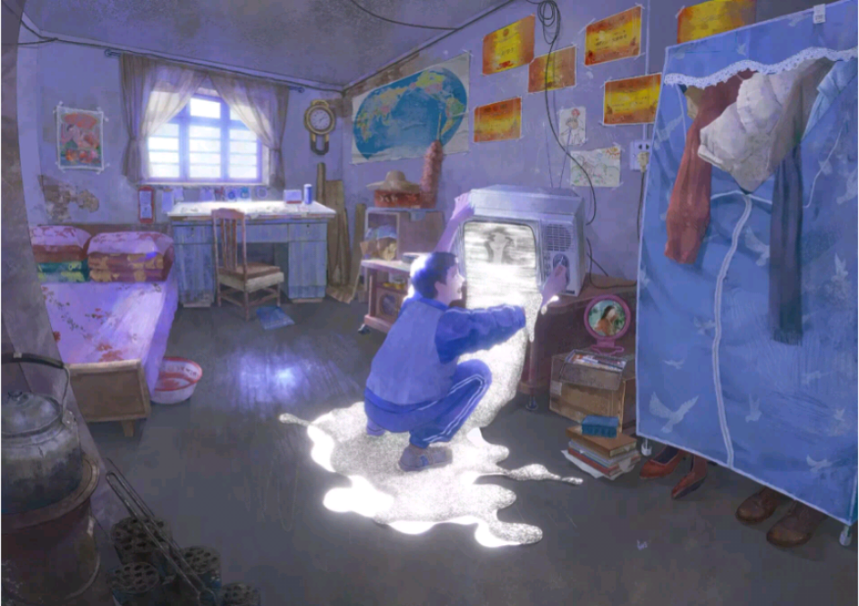 Rồi từ chiếc bàn gỗ cũ kỹ có tấm kính đè lên trên vài tờ tiền cùng những tấm ảnh xưa, ánh mắt cậu lại dời sang chiếc tivi đen trắng với hai chiếc ăng-ten có thể co duỗi kế bên.