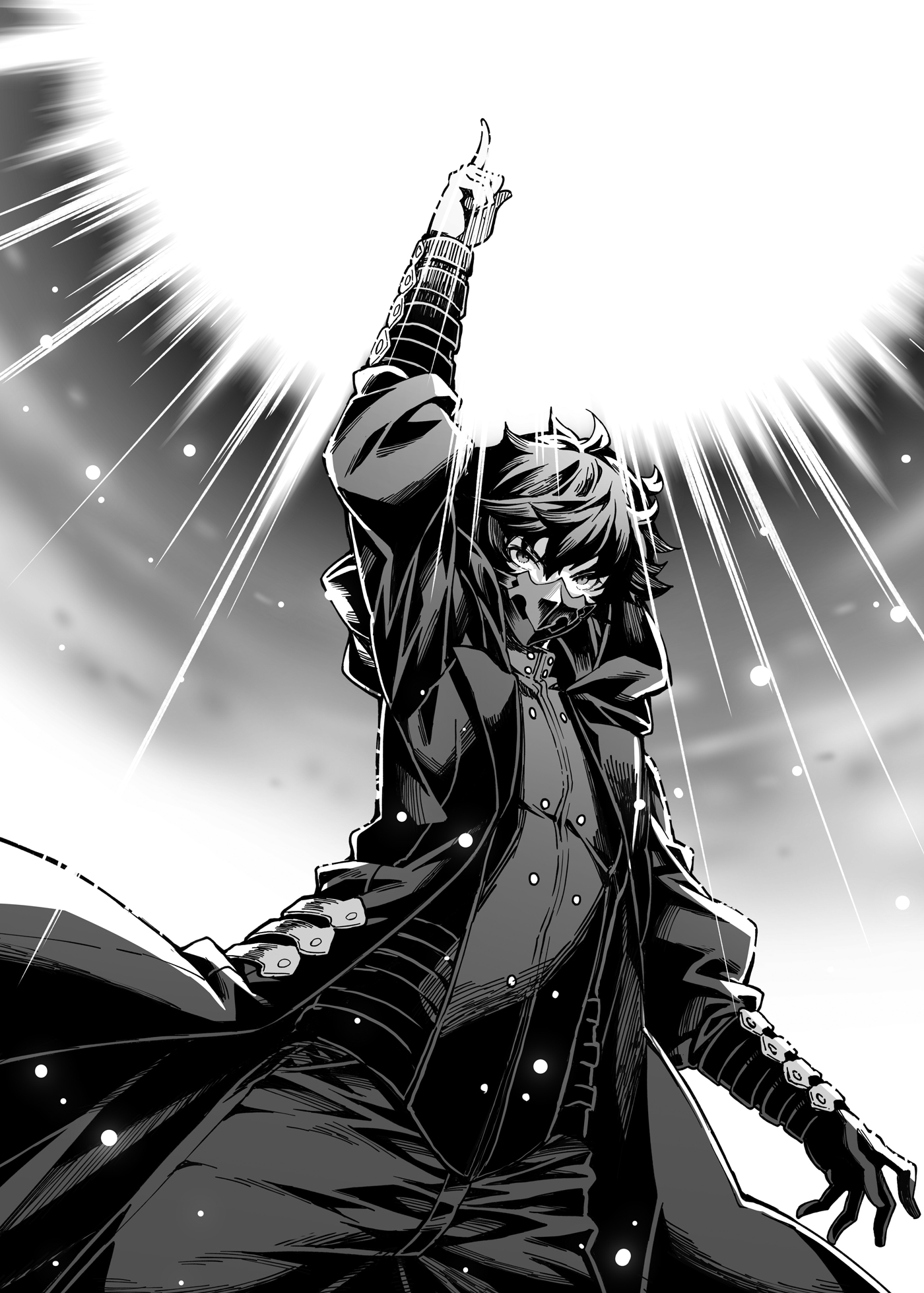 Một luồng sáng nhợt nhạt chiếu rọi bên trong Đấu trường, và một làn sương đỏ đen bao bọc lấy Souta trong khi những vật thể lấp lánh giống như lông vũ trôi nổi.