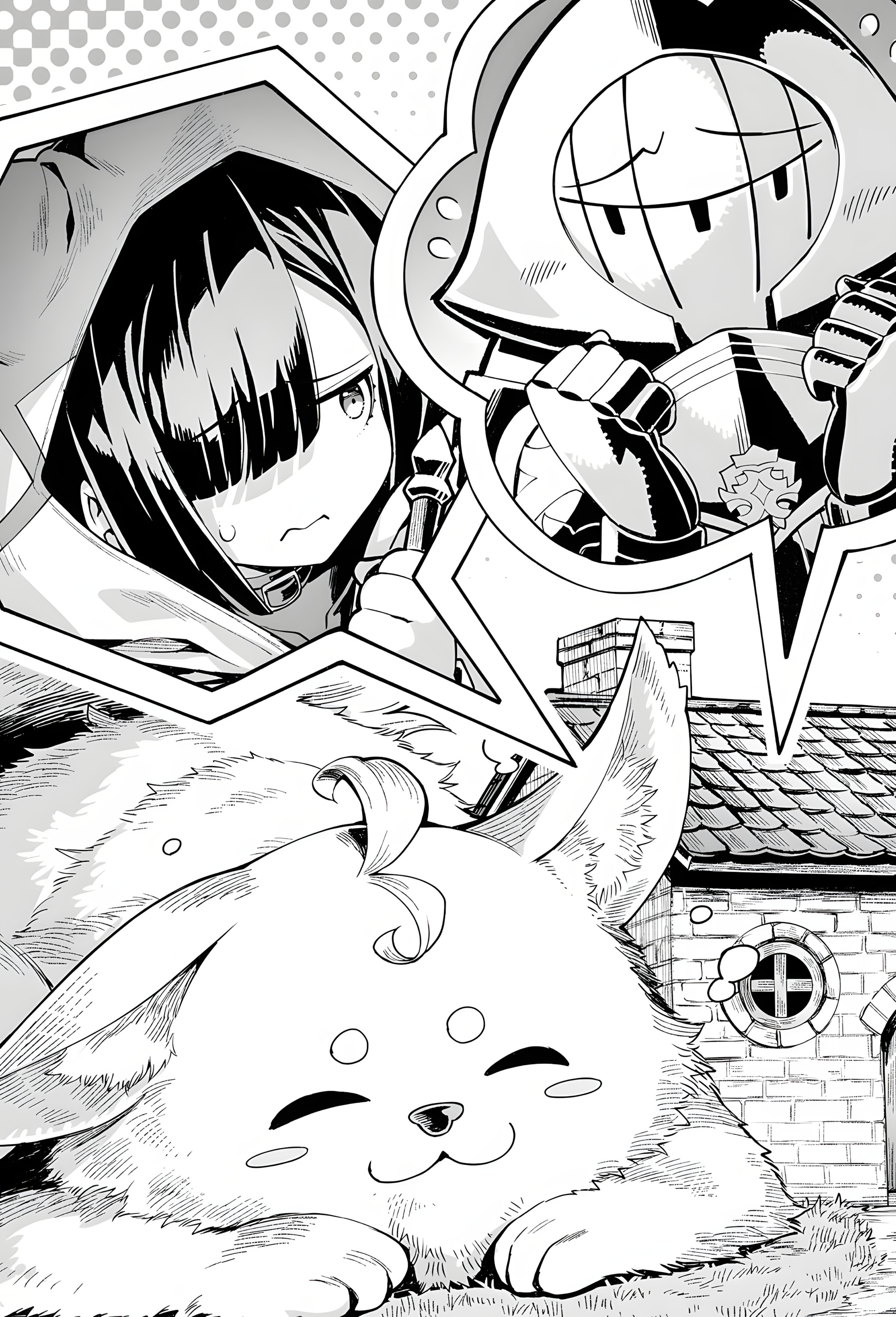 Trong khi tôi giải thích chiến thuật và mọi người chuẩn bị vũ khí, Kuga cũng rút đoản kiếm ra, liếm môi đầy phấn khích vì cơ hội nâng cấp trang bị đã tới. Nào, trận chiến Floor Boss bắt đầu thôi, phải lấy cho bằng được mấy món drop item quý hiếm nào... Đang hừng hực khí thế thì bất ngờ thay, Tenma lại thốt lên rằng con boss đó dễ thương. Điều này khiến ngay cả Kurosaki cũng hoảng hốt chen ngang.